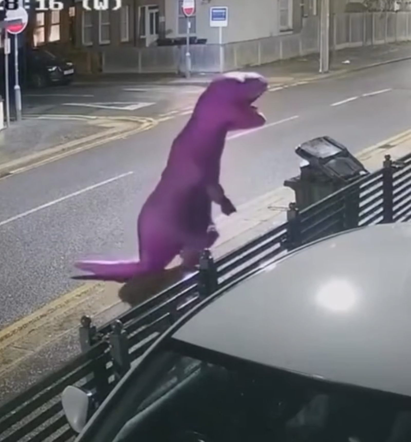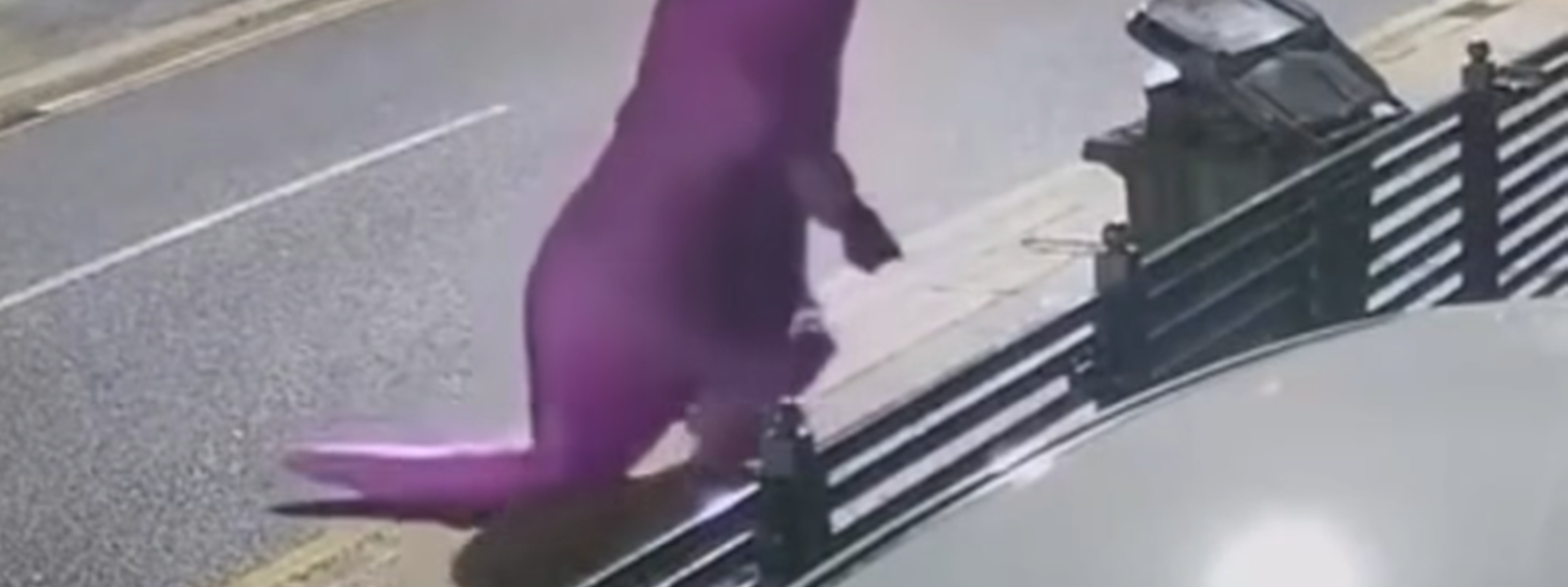 Osoba przebrana za fioletowego dinozaura została uchwycona przez kamery, a nagranie obiegło sieć.