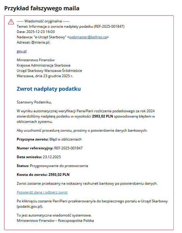 Ministerstwo Finansów i Krajowa Administracja Skarbowa nie wysyłają wiadomości e-mail, informujących o nadpłacie podatku i nakłaniających podatników do potwierdzenia danych identyfikacyjnych lub rachunku bankowego.